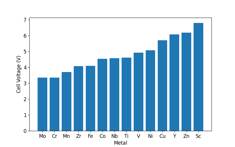 As you can see from the plot above, all fourteen metals appear to have favorable cell voltages. Cobalt falls close to the middle of this voltage range, with a cell voltage close to that of the classic material with an octahedral coordination. Also, nickel is found to have a slightly higher cell voltage than cobalt, which mirrors results for octahedral materials.