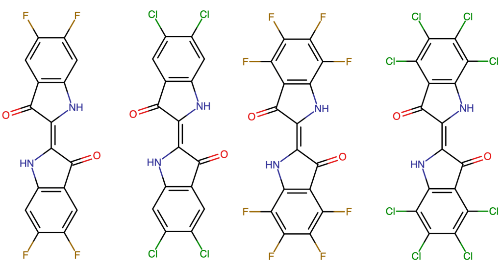 An almost limitless amount of derivatives of indigo can be imagined. This initial study focuses on seeing if halogenation with fluorine or chlorine can lead to better harvesting of the solar spectrum. Halogenation is only an entry point to chemical modification of indigo, and other derivatives may be considered in the future.