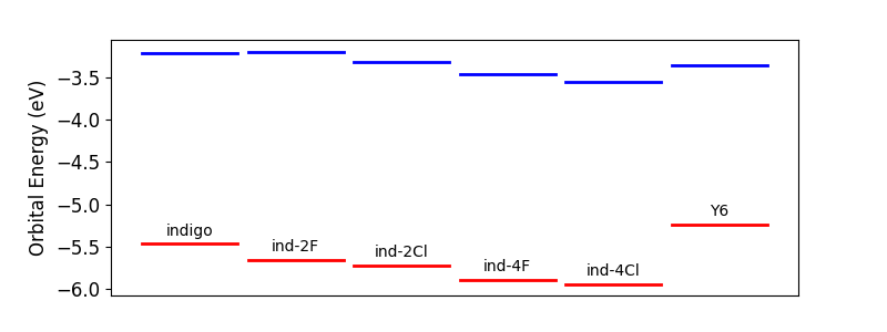 To achieve efficient charge transfer to Y6, the frontier orbitals, especially the lowest unoccupied molecular orbital (or LUMO) need to be close in energy. The plot above shows the energies of these frontier orbitals for indigo, its derivatives, and Y6. We see that halogenating indigo has the effect of lowering the LUMO in energy. Indigo on its own has a LUMO that is only slightly higher in energy than Y6, and chlorinating indigo brings the LUMO almost isoenergetic to Y6, which could drive faster charge transfer. So, the indigo-2Cl derivative may be able to absorb more light and undergo more efficient charge transfer to Y6 or a similar acceptor material. Promising!